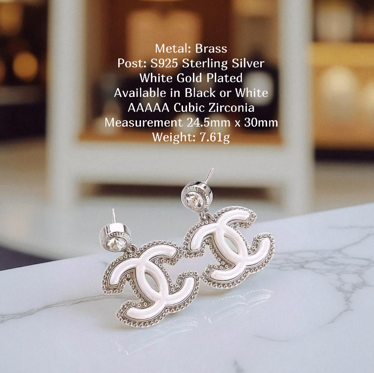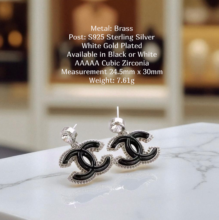 The prominent interlocking double-C motif features a sleek enamel fill (available in classic Black or crisp White) beautifully outlined with delicate silver-tone beading. Each earring dangles gracefully from a sparkling crystal stud, adding a touch of radiant elegance. Perfect for making a chic statement, these earrings effortlessly blend classic design with modern flair.