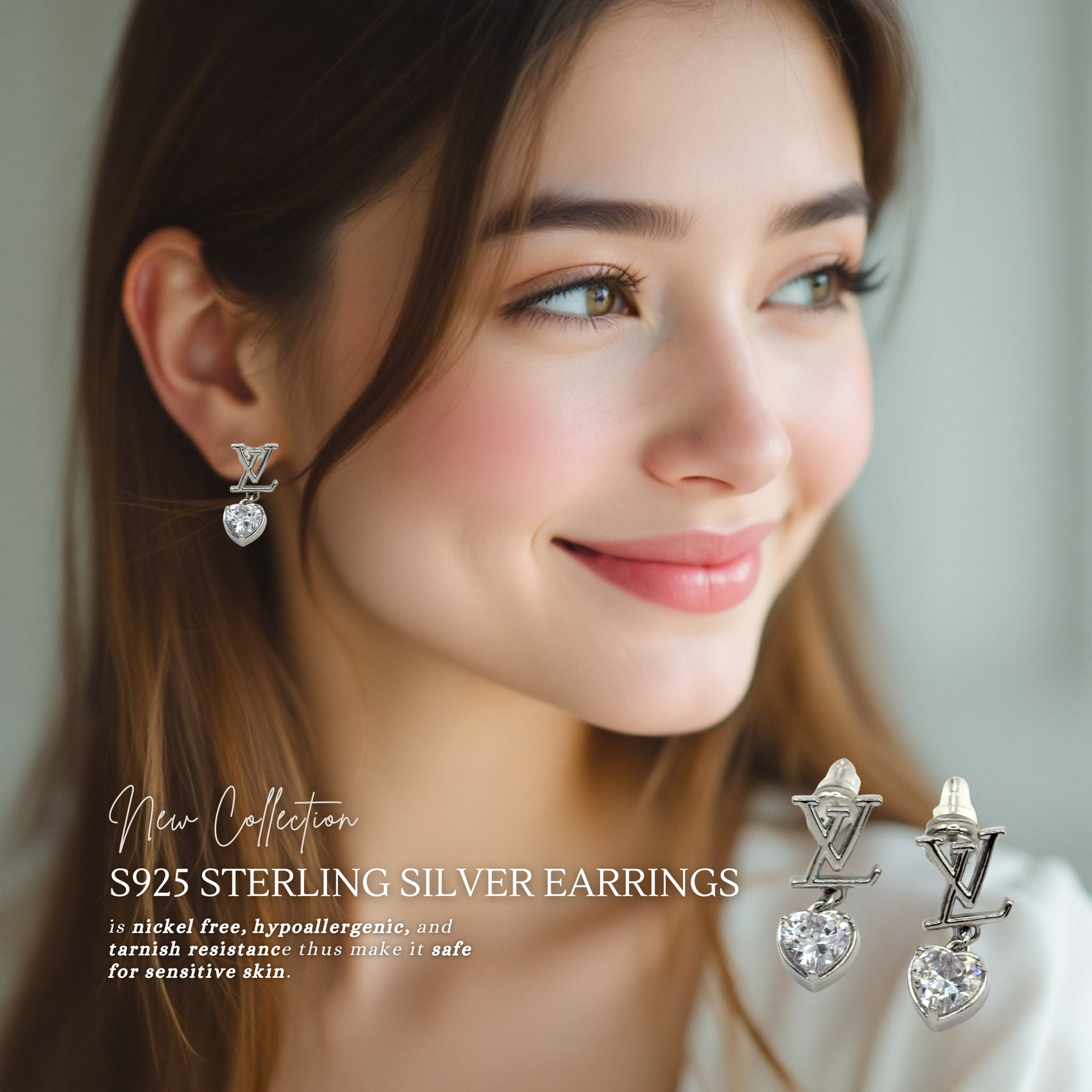 These delightful drop earrings highlight a stylised initial stud from which a sparkling, heart-shaped clear stone gently hangs, adding a romantic and timeless flair. Crafted with a refined, designer-inspired approach to the iconic initial motif, they bring elegance and charm to any ensemble.
