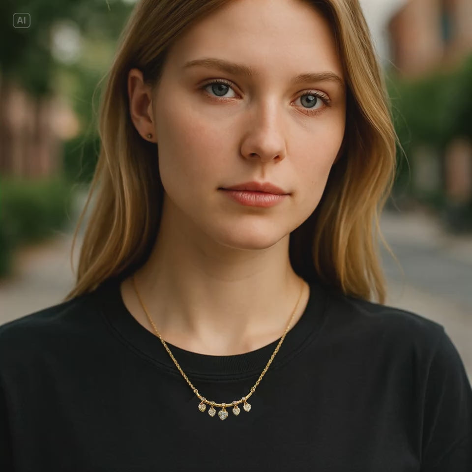 This captivating piece features a delicate curved bar, adorned with sparkling accents, from which five dazzling, pave-set heart charms elegantly suspend. A radiant symbol of love, designed to cherish and inspire.