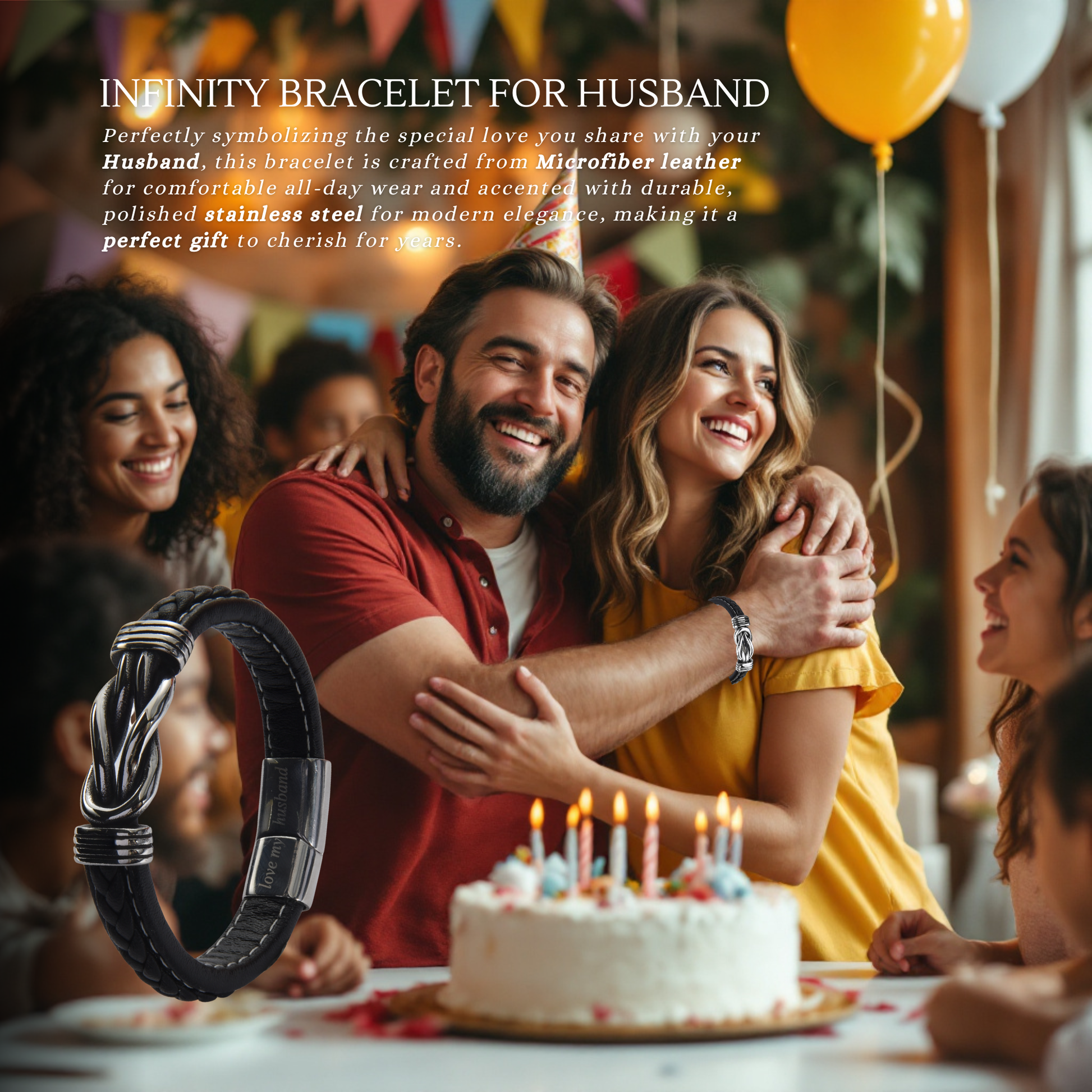 Surprise your husband with this meaningful infinity bracelet. This bracelet is made from Microfiber leather and features a stainless steel infinity emblem, making it a stylish and durable accessory that he can wear with pride.