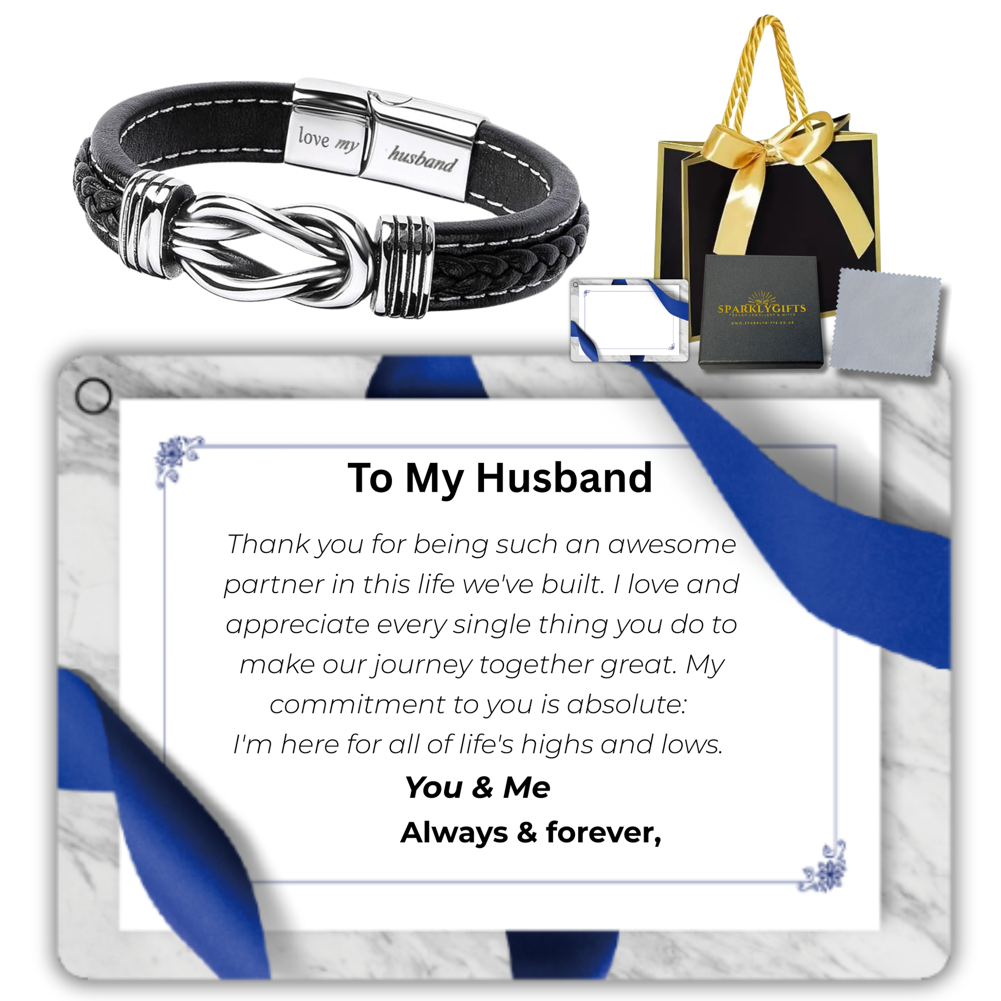 Stainless Steel Infinity Bracelet For Husband Engraved Leather with Personalised Message
