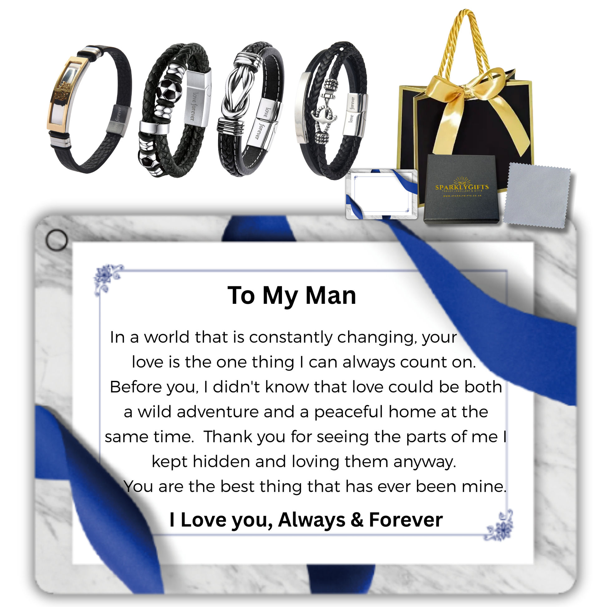 - Message Card ( 56mm x 80mm) " To My Man, In a world that is constantly changing, your love is the one thing I can always count on. Before you, I didn't know that love could be both a wild adventure and a peaceful home at the same time. Thank you for seeing the parts of me I kept hidden and loving them anyway. You are the best thing that has ever been mine. I Love you, Always & Forever "